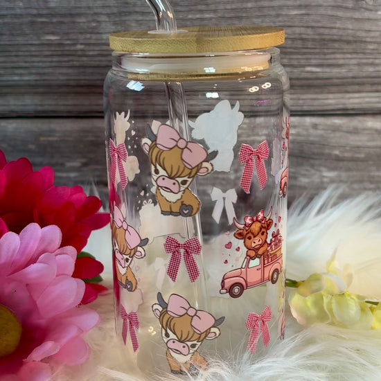 Highland Cow Glass Tumbler – Iced Coffee Cup with Bamboo Lid & Straw
